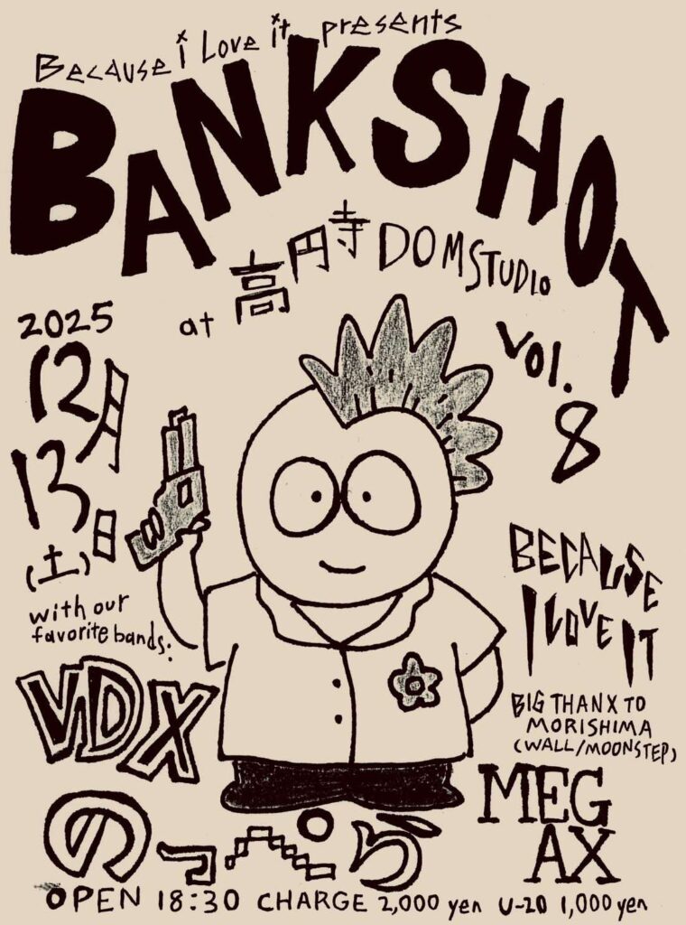 [information] Because I Love It pre. BANKSHOT vol.8 with our favorite bands. 【日時】 2025/12/13 (Sat) OPEN 18:30 【出演】 □Live VDX MEGA X のっぺら Because I Love It BIG THANX TO MORISHIMA …