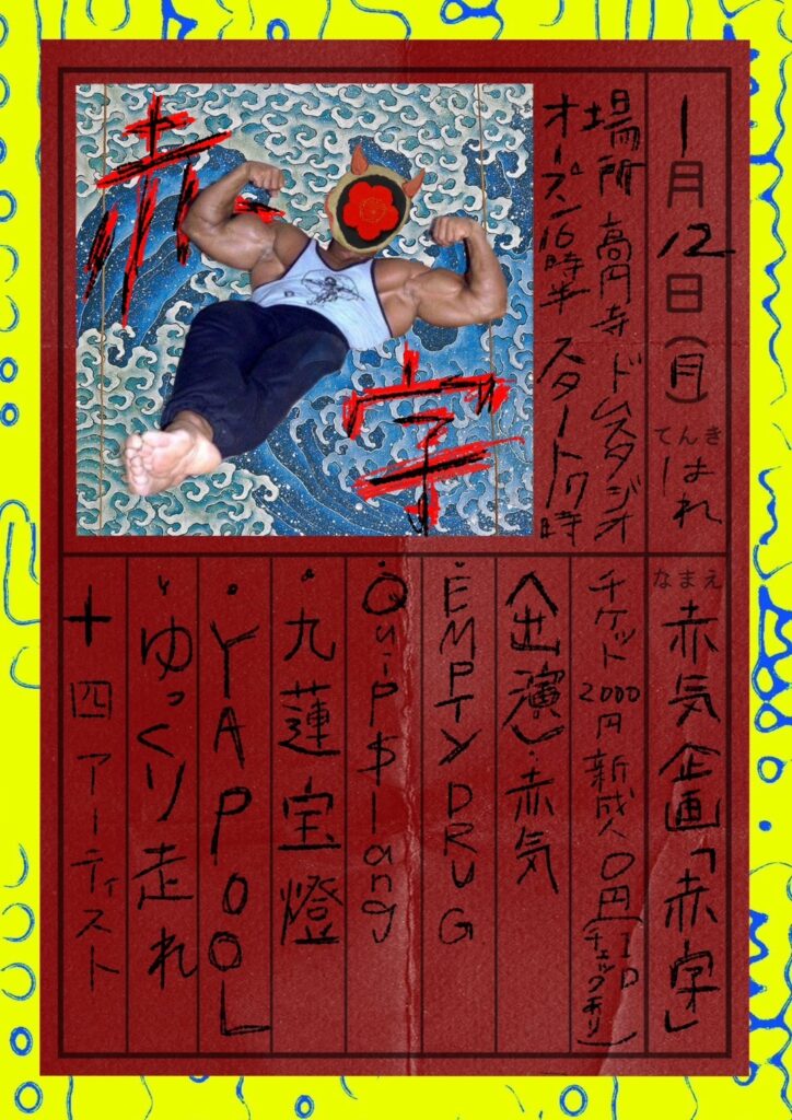 [information] 赤気企画「赤字」 【日時】 2026.1/12 open 16:30 start 17:00 【出演】 赤気 EMPTY DRUG Quip$lang 九蓮宝燈 YAPOOL ゆっくり走れ 十 四アーティスト 【予約先】 https://akagi.bitfan.id/q/4281 [venue] …