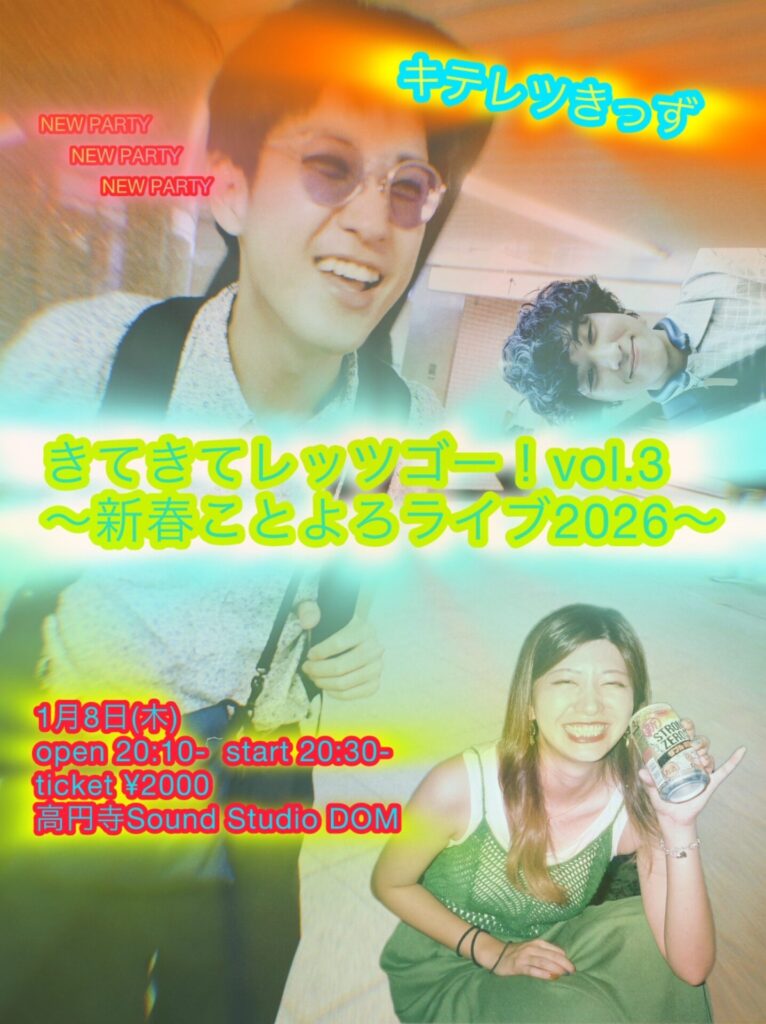 [information] きてきてレッツゴー!vo.3 ~新春ことよろライブ~ 【紹介文】 やっちゃうわよ〜ん 【日時】 2026/01/08 open 20:10 / start 20:30 【出演】 キテレツきっず [venue] D.room [entrance] ¥2000- …