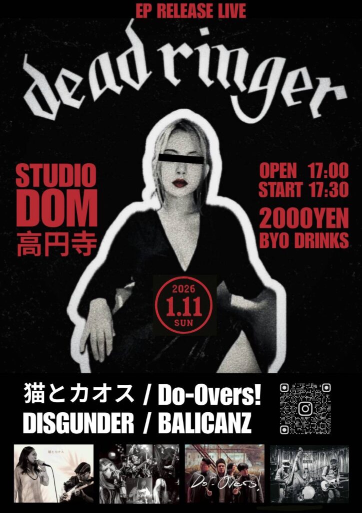 [information] DeadRinger EP Release Party 【ジャンル】 Punk.Psychobilly. Acoustic. 【日時】 2026/1/11(sun) open 17:00 / start 17:30 【出演】 DeadRinger 猫とカオス Do-Overs! DISGUNDER/BALICANZ 【予約先】 …
