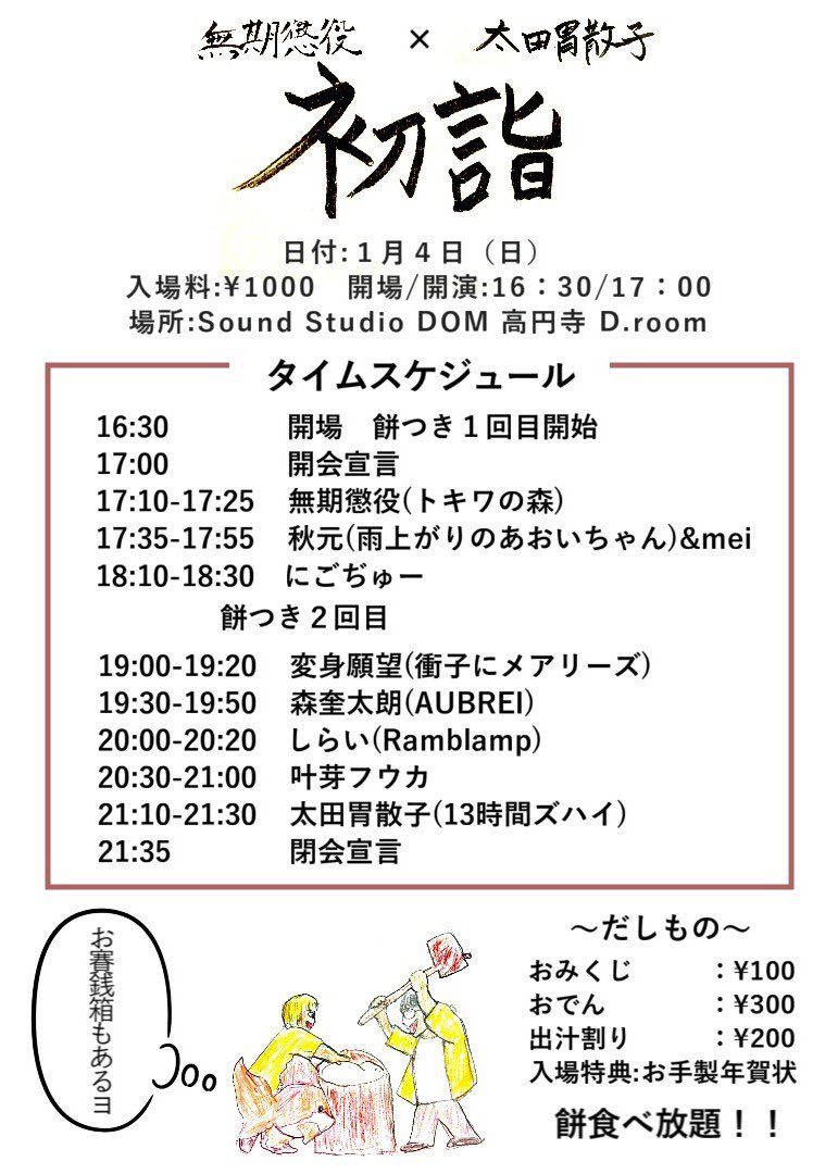 [information] 無期懲役×太田胃散子 pre. 【初詣 vol.2】 2026.01.04(日) 高円寺DOMスタジオ D room 16:30/17:00 出演: 叶芽フウカ しらい(Ramblamp) 森奎太朗(AUBREI) 変身願望(衝子にメアリーズ) にごぢゅー 秋元(雨上がりのあおいちゃん)&mei 無期懲役(トキワの森 …