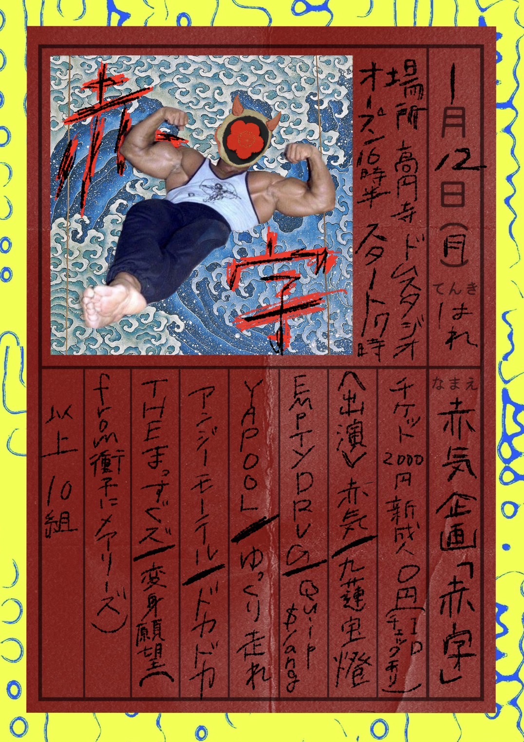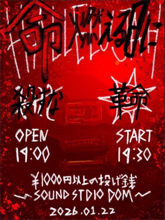 [information] 赤気企画「赤字」 【日時】 2026.1/12 open 16:30 start 17:00 【出演】 赤気 EMPTY DRUG Quip$lang 九蓮宝燈 YAPOOL ゆっくり走れ 十 四アーティスト 【予約先】 https://akagi.bitfan.id/q/4281 [venue] …