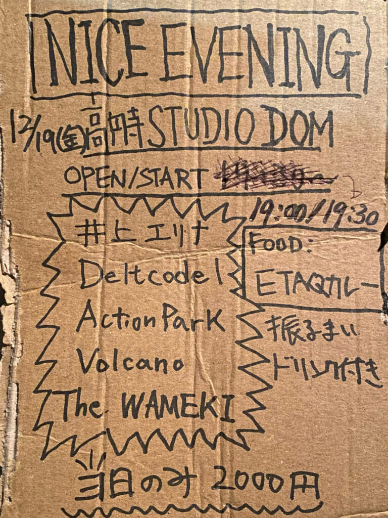 [information] "NICE EVENING" 【日時】 2025/12/19 open/start 19:00/19:30 【出演】 井上エリナ Deltcodel ACTiON PARK VOLCANO The Wameki FOOD ETAQカレー 【Time Table】 19:30-19:55 D …