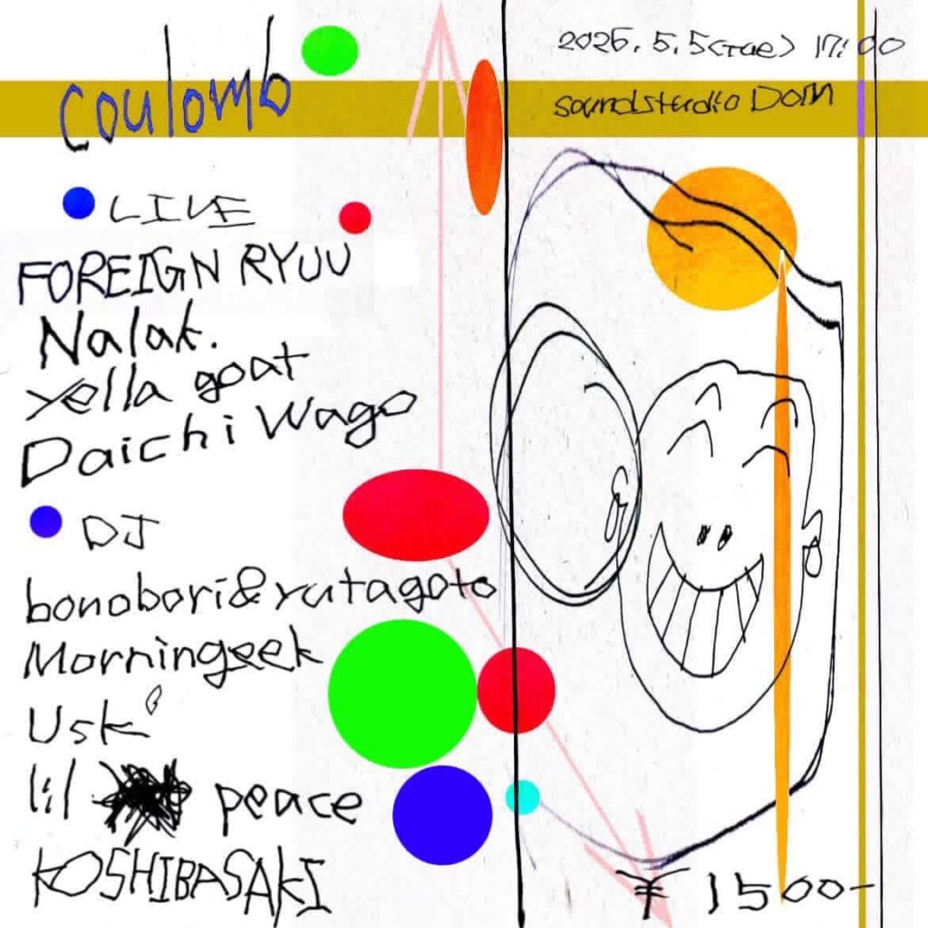 [information] coulomb (クーロン) 【日時】 17:00〜23:00 【出演】LIVE: FOREIGN RYUU Nalak yella goat Daichi Wago DJ: bonobori & yutagoto lilpeace Morningeek Usk° KO SHIBASAKI [venue] …