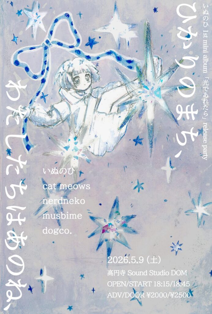[information] いぬのひ 1st minialbum 「光であれたら」release party 『ひかりのまち、わたしたちはあのね、』 【日時】 2026.5.9(土) @高円寺SoundStudioDOM Open/Start18:15/18:45 【出演】 いぬのひ cat meows nerdneko musbime dogco. …