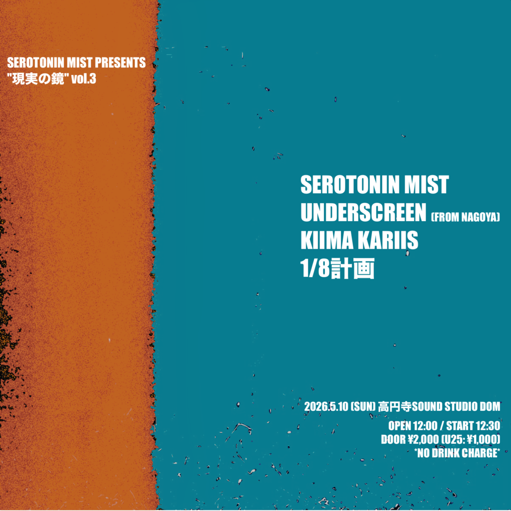[information] 現実の鏡 vol. 3 【日時】 2026年5月10日 OPEN 12:00 START 12:30 【出演】 Serotonin Mist Underscreen Kiima Kariis 1/8計画 【予約先】 serotoninmist@gmail.com [venue] D.ro …