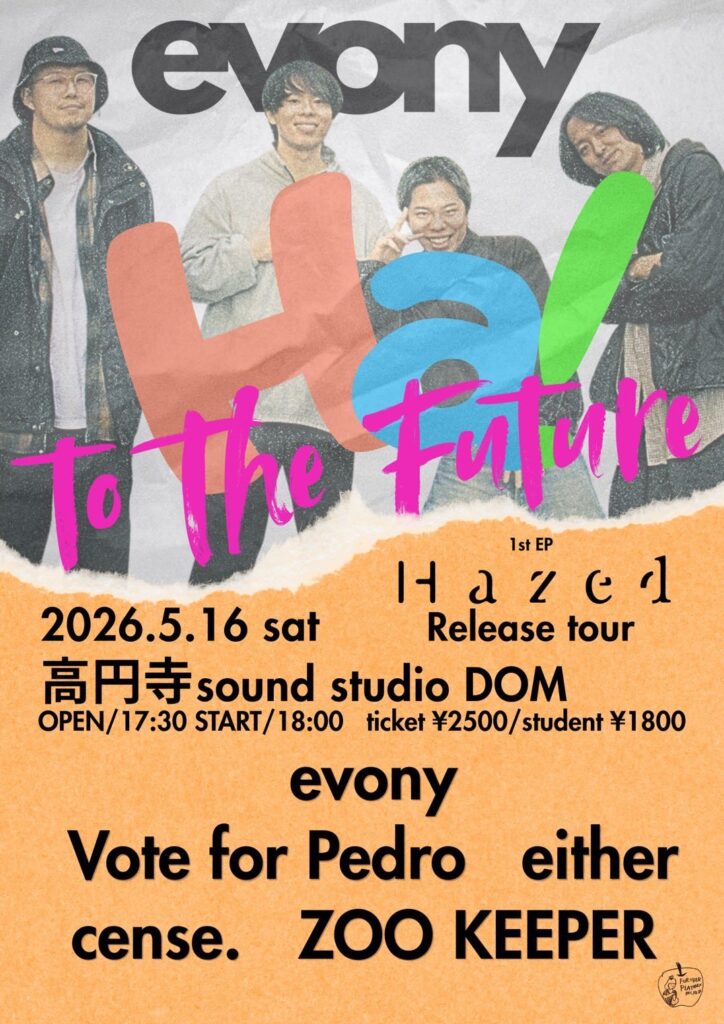 [information] evony 1st EP 「Hazed」Release Tour "Ha To the Future" 【日時】 2026.5.16(sat) OPEN/START 17:30/18:00 【入場料】 Ticket ¥2,500/student ¥1,800 【出演】 act Vote for Pedro evony eith …