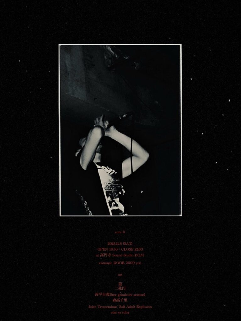 [information] core 0act 蓋 二兆円 波平自殺(free grindcore session) 森高千里 John Tremendous' Soft Adult Explosion rint vs suba 【日時】 2025.11.08 (SAT) OPEN 18:00 / CLOSE 18:30 【予約先】 当日券のみ …