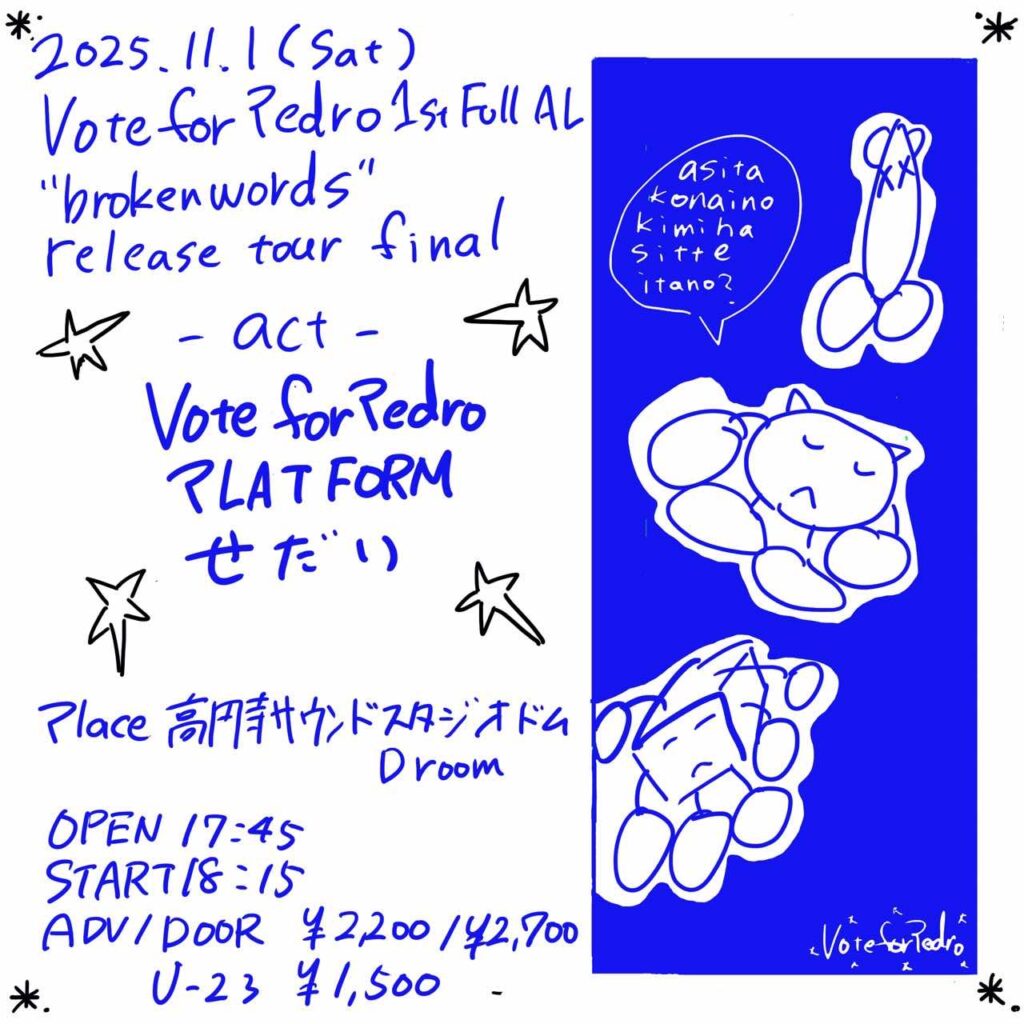 [information] 2025.11.1 (Sat) Vote for Pedro 1st Full AL "broken words" release tour final -act - Vote for Pedro PLATFORM せだい Place 高円寺サウンドスタジオドム OPEN 17:45 START18:15 [venue] …