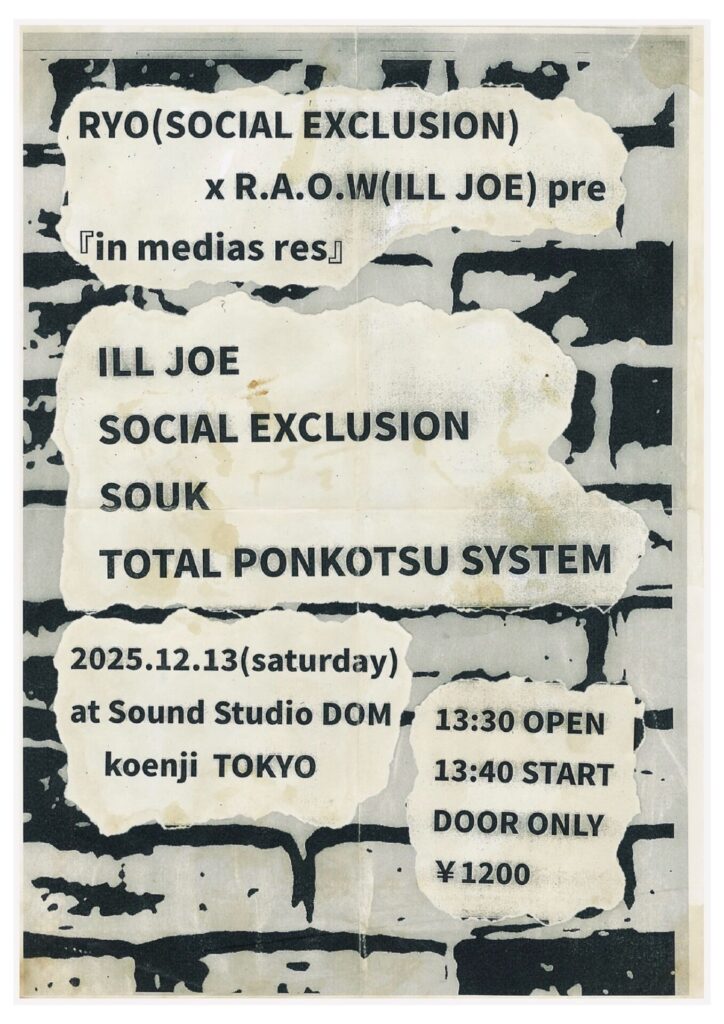 [information] RYO × R.A.O.W pre. 『in medias res』 【日時】 2025.12.13(土) OPEN:13:30/START:13:40 【出演】 SOCIAL EXCLUSION ILL JOE souk Total Ponkotsu System [venue] D.room …