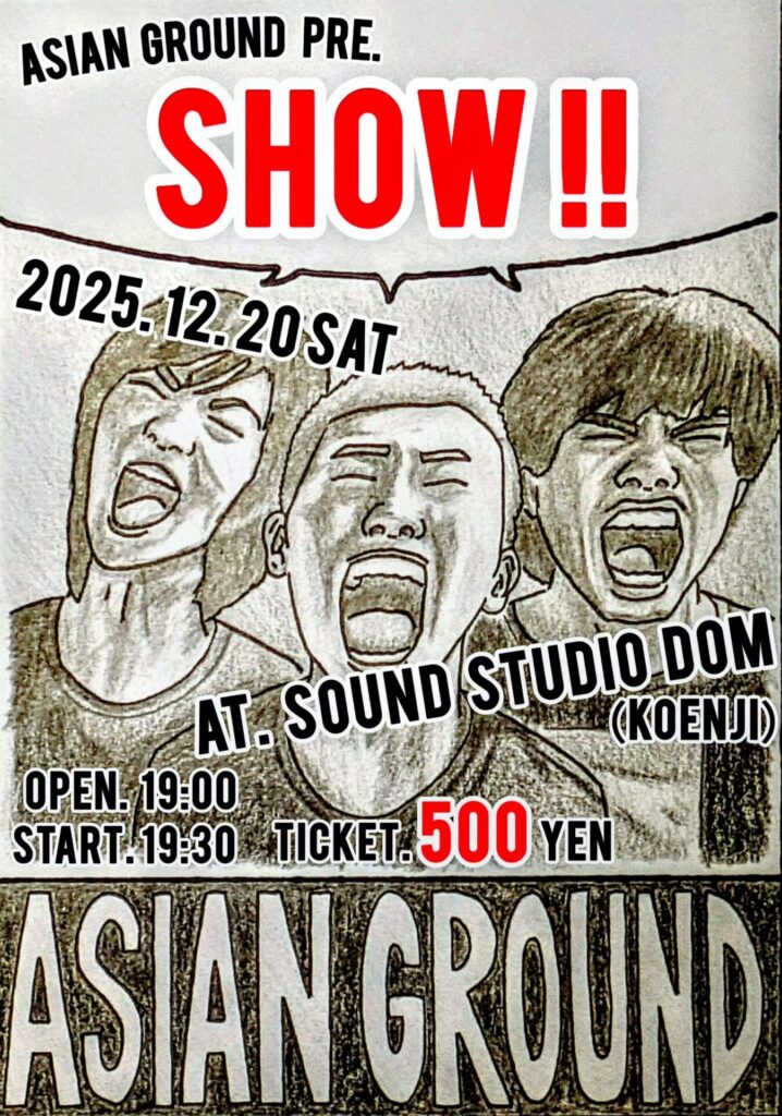 [information] ASIAN GROUND PRE. SHOW !! イタリアでのファーストライブを敢行した、ASIAN GROUNDが遂に日本でワンマンライブを開催! 唯一無二のパンクサウンドを見逃すな! 【日時】 2025/12/20 OPEN. 19:00 START. 19:30 【出演】 ASIAN GROUND 【予約先】 AS …