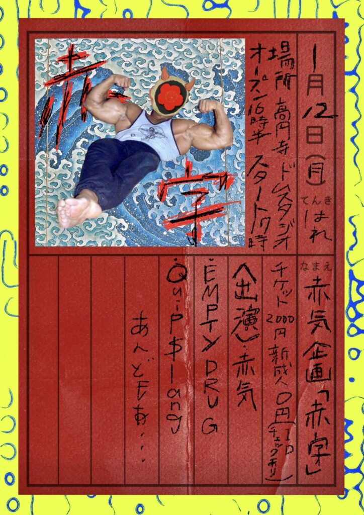 [information] 赤字 【日時】 2026.1/12 open 16:30 start 17:00 【出演】 赤気/EMPTY DRUG/Quip $lang/九連宝燈/and more(計10バンド予定) 【予約先】 https://akagi.bitfan.id/q/4281などなど [venue] D.roo …