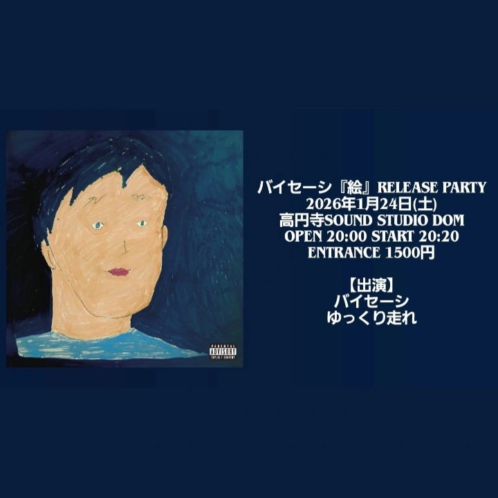 [information] バイセーシ『絵』Release Party 【日時】 2026年1月24日(土) OPEN 20:00 START 20:20 【出演】 バイセーシ、ゆっくり走れ 【予約先】 psonrecords@gmail.com [venue] D.room [entrance] …