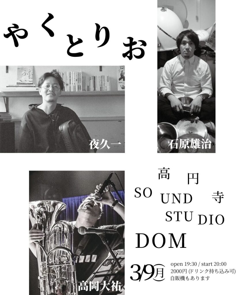 [information] 2026/03/09(月) 高円寺 Sound Studio Dom D.room open 19:30 / start 20:00 出演: やくとりお ・夜久一 vo,gt ・高岡大祐 tuba ・石原雄治 drums 料金: 2000円 ドリンク持ち込み可 自販機もあります 今回は高円寺スタジオドムにて! やくおりお初 …