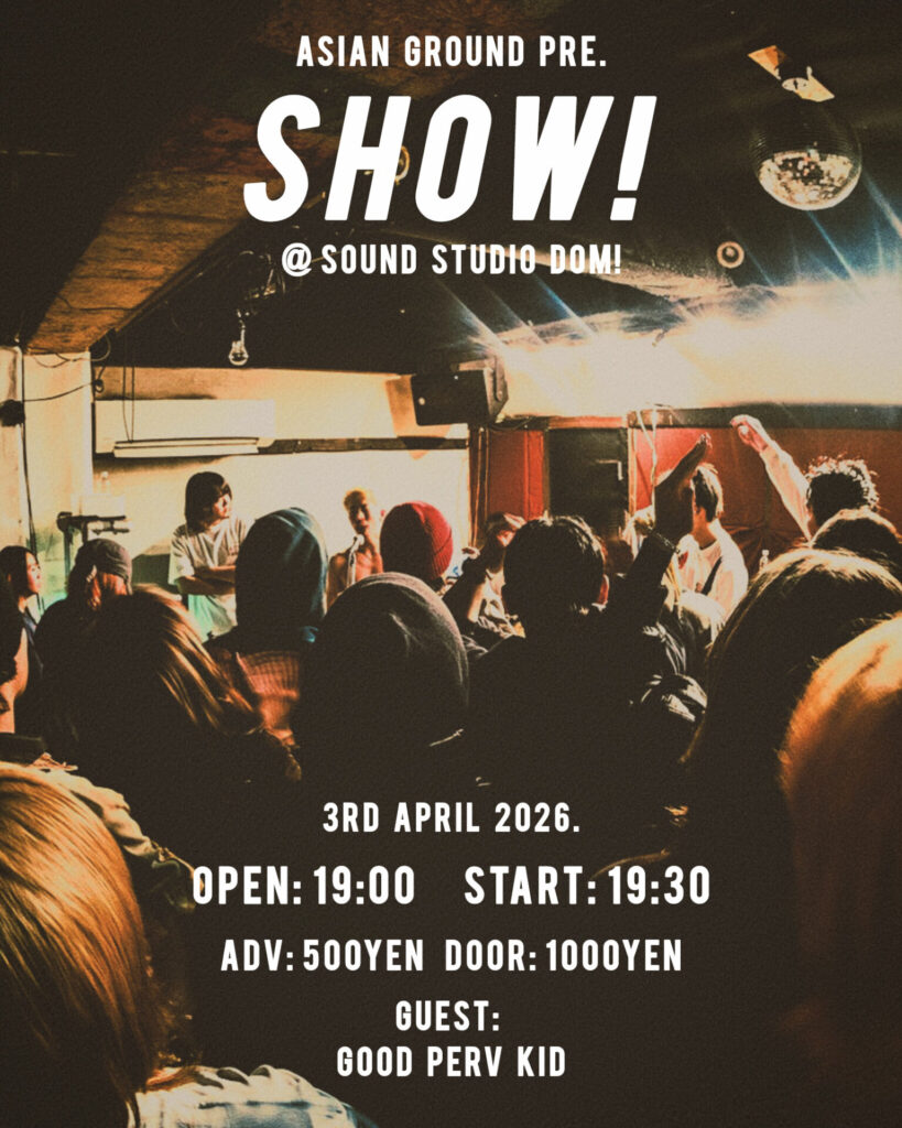 [information] ASIAN GROUND pre. "SHOW!" 【日時】 2026.04.03 (FRI) AT : Sound Studio DOM! (高円寺) OPEN : 19:00 START : 19:30 【出演】 ASIAN GROUND Guest: GOOD PERV KID [venue] …